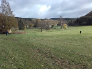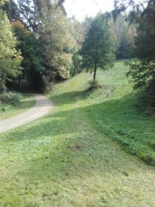ein Blick auf Start (links im Wald) und Ziel (rechts am Hang)